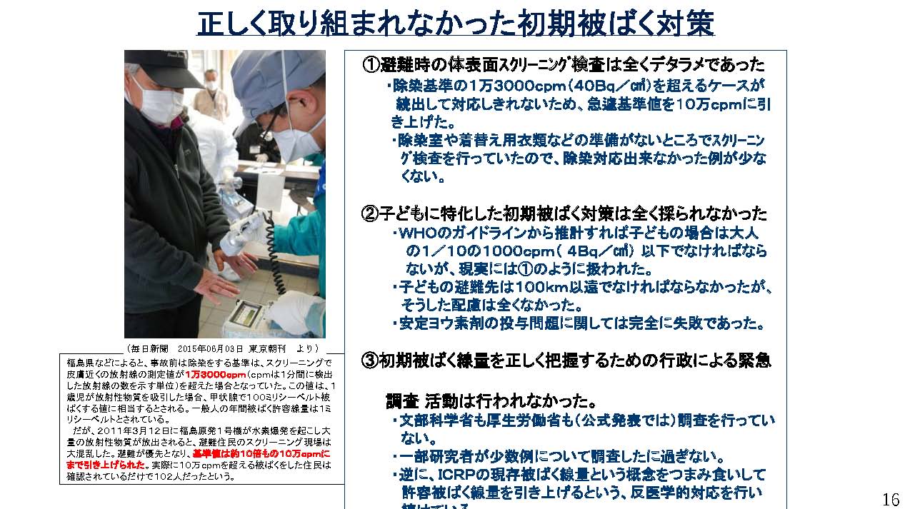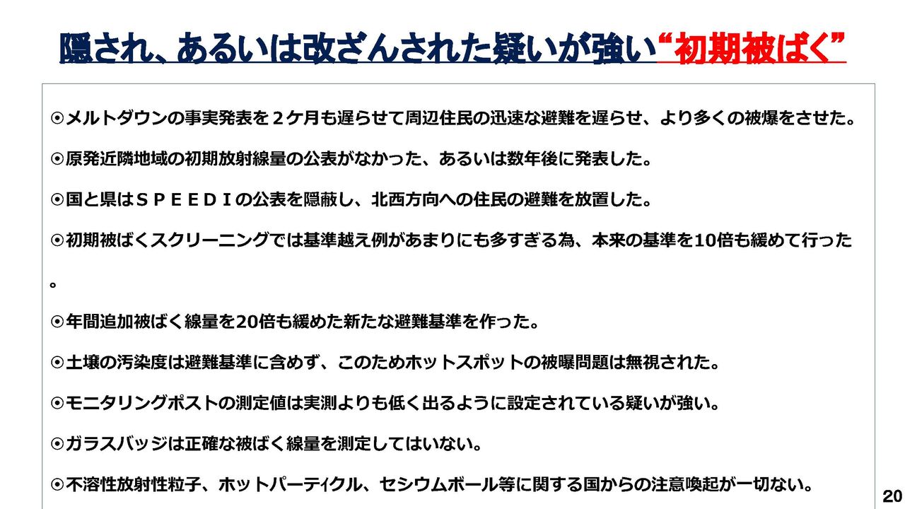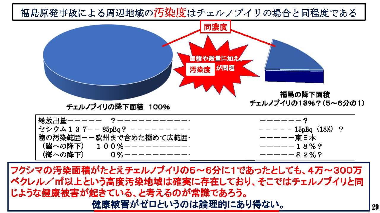「東電、県、御用学者、国は『チェルノブイリより放出放射線量は少ない』『線量が少ないから健康被害はない』とキャンペーンし、そのためにデータを隠ぺいしたり改ざん、ねつ造している」と弾劾。氏は身近な健康被害について、地道で丹念な調査をされ、その事実をもって反論しています。